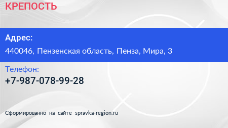 КРЕПОСТЬ по адресу 440046, Пензенская область, Пенза, Мира, 3 в дальнейшем Организация, размещена в следующих категориях: