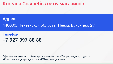 Koreana Cosmetics, сеть магазинов по адресу 440000, Пензенская область, Пенза, Бакунина, 29 в дальнейшем Организация, размещена в следующих категориях: