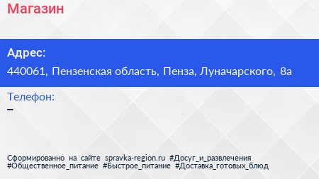 Магазин по адресу 440061, Пензенская область, Пенза, Луначарского, 8а в дальнейшем Организация, размещена в следующих категориях: