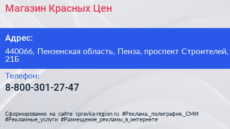 Магазин Красных Цен по адресу 440066, Пензенская область, Пенза, проспект Строителей, 21Б в дальнейшем Организация, размещена в следующих категориях:
