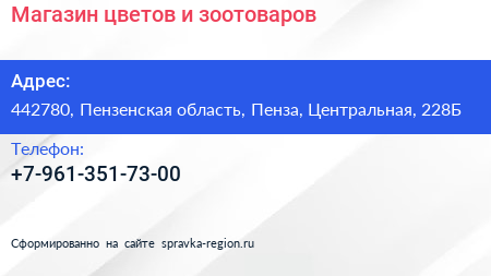 Магазин цветов и зоотоваров по адресу 442780, Пензенская область, Пенза, Центральная, 228Б в дальнейшем Организация, размещена в следующих категориях: