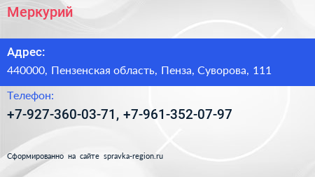 Меркурий по адресу 440000, Пензенская область, Пенза, Суворова, 111 в дальнейшем Организация, размещена в следующих категориях: