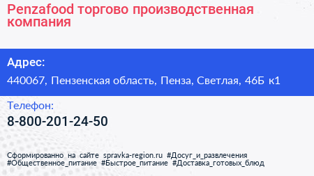 Penzafood, торгово-производственная компания по адресу 440067, Пензенская область, Пенза, Светлая, 46Б к1 в дальнейшем Организация, размещена в следующих категориях: