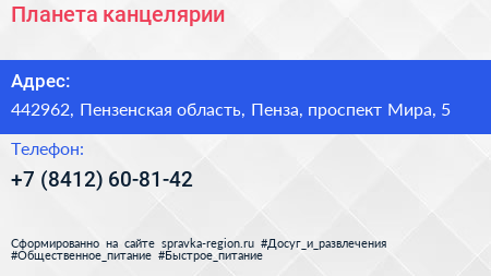 Планета канцелярии по адресу 442962, Пензенская область, Пенза, проспект Мира, 5 в дальнейшем Организация, размещена в следующих категориях: