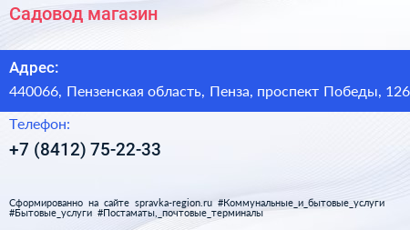 Садовод, магазин по адресу 440066, Пензенская область, Пенза, проспект Победы, 126 в дальнейшем Организация, размещена в следующих категориях: