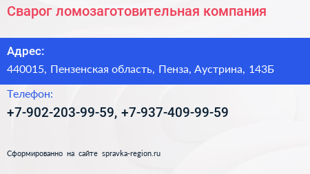 Сварог, ломозаготовительная компания по адресу 440015, Пензенская область, Пенза, Аустрина, 143Б в дальнейшем Организация, размещена в следующих категориях:
