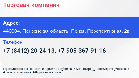 Торговая компания по адресу 440004, Пензенская область, Пенза, Перспективная, 2в в дальнейшем Организация, размещена в следующих категориях: