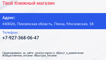 Твой Книжный, магазин по адресу 440026, Пензенская область, Пенза, Московская, 18 в дальнейшем Организация, размещена в следующих категориях: