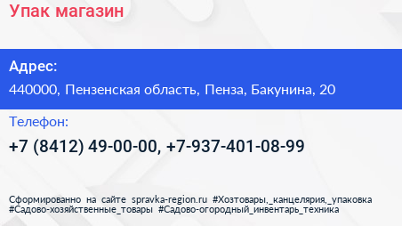 Упак, магазин по адресу 440000, Пензенская область, Пенза, Бакунина, 20 в дальнейшем Организация, размещена в следующих категориях: