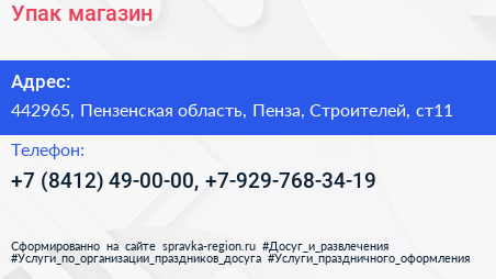 Упак, магазин по адресу 442965, Пензенская область, Пенза, Строителей, ст11 в дальнейшем Организация, размещена в следующих категориях: