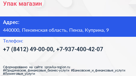 Упак, магазин по адресу 440000, Пензенская область, Пенза, Куприна, 9 в дальнейшем Организация, размещена в следующих категориях: