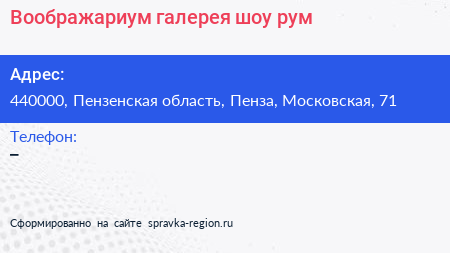 Воображариум, галерея-шоу-рум по адресу 440000, Пензенская область, Пенза, Московская, 71 в дальнейшем Организация, размещена в следующих категориях: