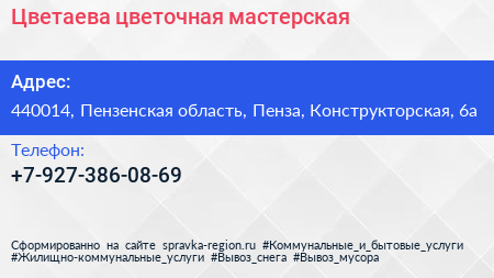 Цветаева, цветочная мастерская по адресу 440014, Пензенская область, Пенза, Конструкторская, 6а в дальнейшем Организация, размещена в следующих категориях: