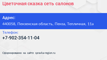 Цветочная сказка, сеть салонов по адресу 440058, Пензенская область, Пенза, Тепличная, 11а в дальнейшем Организация, размещена в следующих категориях: