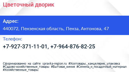 Цветочный дворик по адресу 440072, Пензенская область, Пенза, Антонова, 47 в дальнейшем Организация, размещена в следующих категориях: