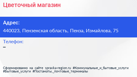 Цветочный магазин по адресу 440023, Пензенская область, Пенза, Измайлова, 75 в дальнейшем Организация, размещена в следующих категориях: