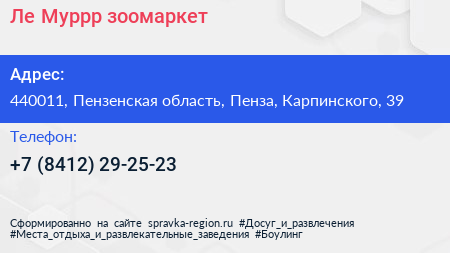 Ле`Муррр, зоомаркет по адресу 440011, Пензенская область, Пенза, Карпинского, 39 в дальнейшем Организация, размещена в следующих категориях: