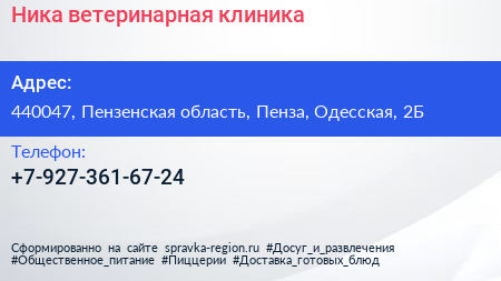 Ника, ветеринарная клиника по адресу 440047, Пензенская область, Пенза, Одесская, 2Б в дальнейшем Организация, размещена в следующих категориях:
