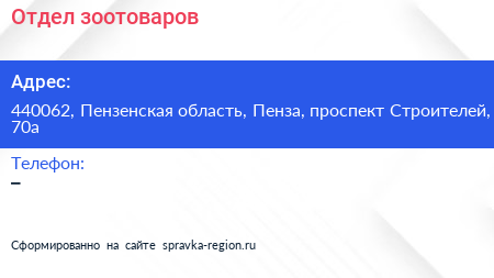 Отдел зоотоваров по адресу 440062, Пензенская область, Пенза, проспект Строителей, 70а в дальнейшем Организация, размещена в следующих категориях: