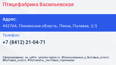 Птицефабрика Васильевская по адресу 442764, Пензенская область, Пенза, Полевая, 1/1 в дальнейшем Организация, размещена в следующих категориях: