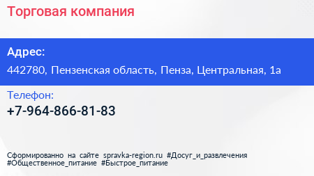 Торговая компания по адресу 442780, Пензенская область, Пенза, Центральная, 1а в дальнейшем Организация, размещена в следующих категориях:
