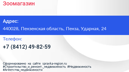 Зоомагазин по адресу 440028, Пензенская область, Пенза, Ударная, 24 в дальнейшем Организация, размещена в следующих категориях:
