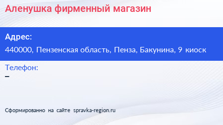 Аленушка, фирменный магазин по адресу 440000, Пензенская область, Пенза, Бакунина, 9 киоск в дальнейшем Организация, размещена в следующих категориях: