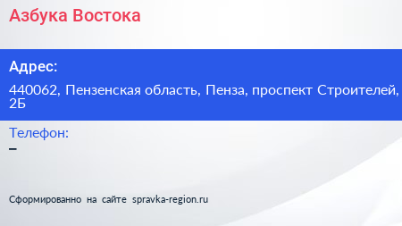 Азбука Востока по адресу 440062, Пензенская область, Пенза, проспект Строителей, 2Б в дальнейшем Организация, размещена в следующих категориях: