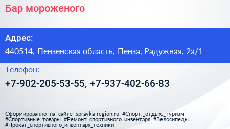 Бар мороженого по адресу 440514, Пензенская область, Пенза, Радужная, 2а/1 в дальнейшем Организация, размещена в следующих категориях: