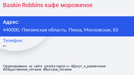 Baskin Robbins, кафе-мороженое по адресу 440000, Пензенская область, Пенза, Московская, 83 в дальнейшем Организация, размещена в следующих категориях: