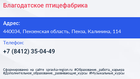 Благодатское, птицефабрика по адресу 440034, Пензенская область, Пенза, Калинина, 114 в дальнейшем Организация, размещена в следующих категориях: