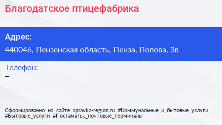 Благодатское, птицефабрика по адресу 440046, Пензенская область, Пенза, Попова, 3в в дальнейшем Организация, размещена в следующих категориях: