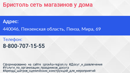 Бристоль, сеть магазинов у дома по адресу 440046, Пензенская область, Пенза, Мира, 69 в дальнейшем Организация, размещена в следующих категориях: