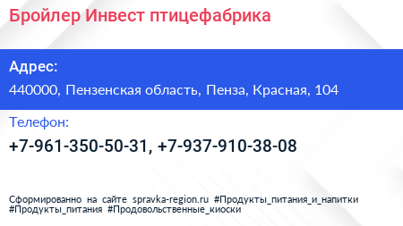 Бройлер-Инвест, птицефабрика по адресу 440000, Пензенская область, Пенза, Красная, 104 в дальнейшем Организация, размещена в следующих категориях: