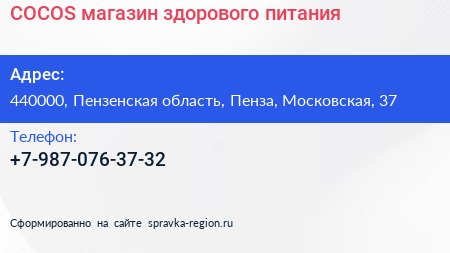 COCOS, магазин здорового питания по адресу 440000, Пензенская область, Пенза, Московская, 37 в дальнейшем Организация, размещена в следующих категориях: