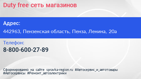 Duty free, сеть магазинов по адресу 442963, Пензенская область, Пенза, Ленина, 20а в дальнейшем Организация, размещена в следующих категориях: