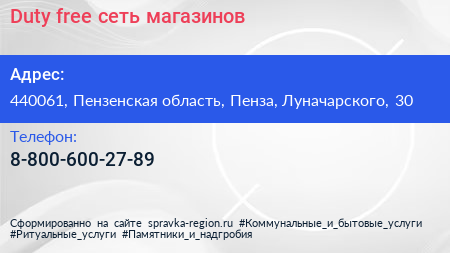 Duty free, сеть магазинов по адресу 440061, Пензенская область, Пенза, Луначарского, 30 в дальнейшем Организация, размещена в следующих категориях: