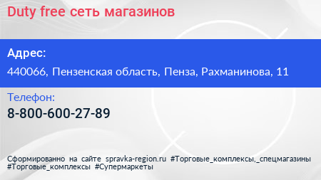 Duty free, сеть магазинов по адресу 440066, Пензенская область, Пенза, Рахманинова, 11 в дальнейшем Организация, размещена в следующих категориях: