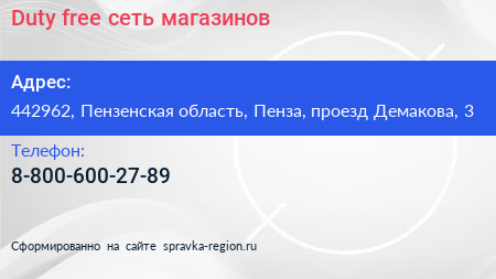 Duty free, сеть магазинов по адресу 442962, Пензенская область, Пенза, проезд Демакова, 3 в дальнейшем Организация, размещена в следующих категориях: