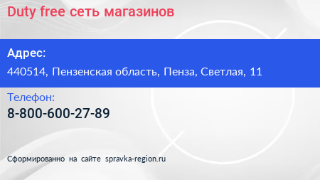 Duty free, сеть магазинов по адресу 440514, Пензенская область, Пенза, Светлая, 11 в дальнейшем Организация, размещена в следующих категориях: