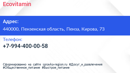 Ecovitamin по адресу 440000, Пензенская область, Пенза, Кирова, 73 в дальнейшем Организация, размещена в следующих категориях: