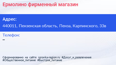 Ермолино, фирменный магазин по адресу 440011, Пензенская область, Пенза, Карпинского, 33в в дальнейшем Организация, размещена в следующих категориях: