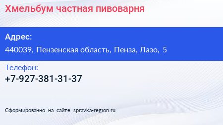 Хмельбум, частная пивоварня по адресу 440039, Пензенская область, Пенза, Лазо, 5 в дальнейшем Организация, размещена в следующих категориях: