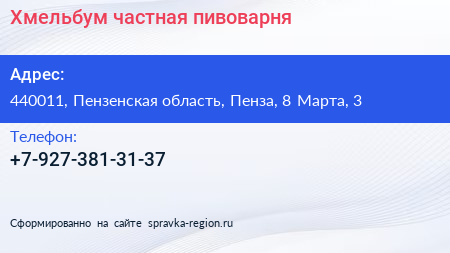 Хмельбум, частная пивоварня по адресу 440011, Пензенская область, Пенза, 8 Марта, 3 в дальнейшем Организация, размещена в следующих категориях: