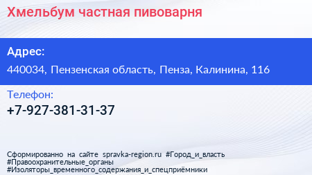 Хмельбум, частная пивоварня по адресу 440034, Пензенская область, Пенза, Калинина, 116 в дальнейшем Организация, размещена в следующих категориях: