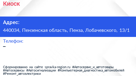 Киоск по адресу 440034, Пензенская область, Пенза, Лобачевского, 13/1 в дальнейшем Организация, размещена в следующих категориях:
