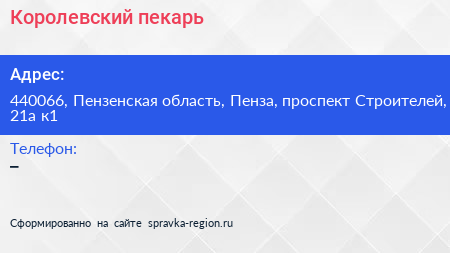 Королевский пекарь по адресу 440066, Пензенская область, Пенза, проспект Строителей, 21а к1 в дальнейшем Организация, размещена в следующих категориях: