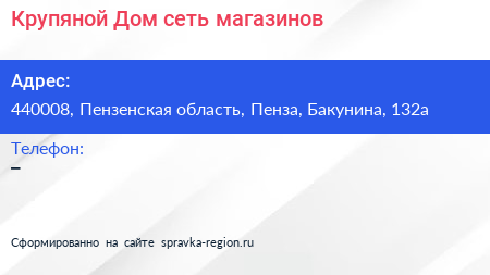 Крупяной Дом, сеть магазинов по адресу 440008, Пензенская область, Пенза, Бакунина, 132а в дальнейшем Организация, размещена в следующих категориях: