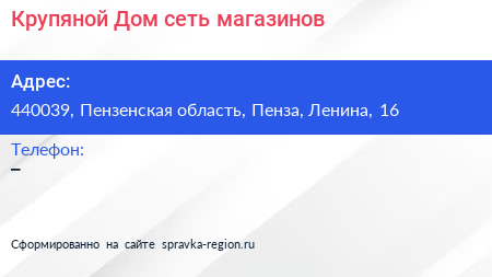 Крупяной Дом, сеть магазинов по адресу 440039, Пензенская область, Пенза, Ленина, 16 в дальнейшем Организация, размещена в следующих категориях: