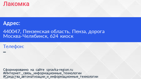Лакомка по адресу 440047, Пензенская область, Пенза, дорога Москва-Челябинск, 624 киоск в дальнейшем Организация, размещена в следующих категориях: